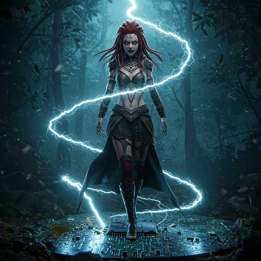 In a dynamic spiral of lightning, a glorious young woman stands with an air of confidence, her stunningly perfect face illuminated by the electric glow. Her full figure is grounded on a circuit board, adorned in intricately designed clothing that exudes elegance. She strikes a captivating pose in a fantastical scene, reminiscent of artstation's finest renditions, with a hyper-maximalist, overdetailed cinematic tribal dark fantasy vibe. Her face is detailed, exuding an epic-moody aura with a backdrop of dense, mysterious woods. Rendered in 8k resolution and using ultra-detailed quality 3D Octane technology, the scene captures photorealistic concept art with sharp focus and flawless composition. Her expression is enhanced by an evil smile and wild, intense eyes, accentuating perfect hands, eyes, and lips. This high-definition, HDR wallpaper offers an exquisite blend of majesty and enigma.