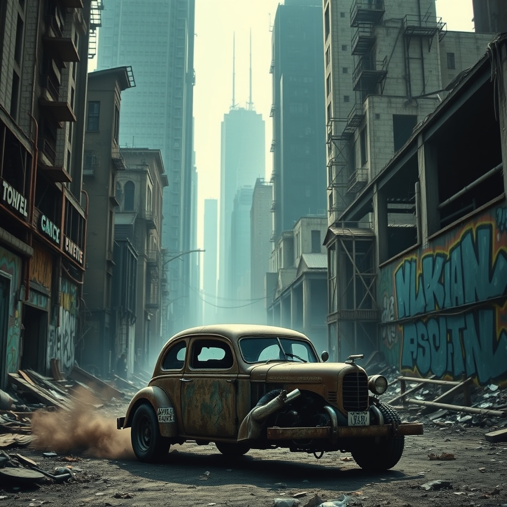 In a dystopian cityscape, a rusted engine purrs to life amidst the desolation, the somber remnants of a once-thriving metropolis now a bleak expanse of crumbling structures. Dramatic shadows cast by twisted skyscrapers loom over a deformed, simple car weaving through the alleyways, its existence a noisy defiance against the silence. The air, thick with the blur of dust and decay, hangs in low contrast with the vibrant, colorful graffiti that bursts defiantly across every wall. Despite the ugliness and chaos, an undercurrent of cheerful optimism courses through the city, a testament to the resilient spirit of those who navigate its fractured streets.