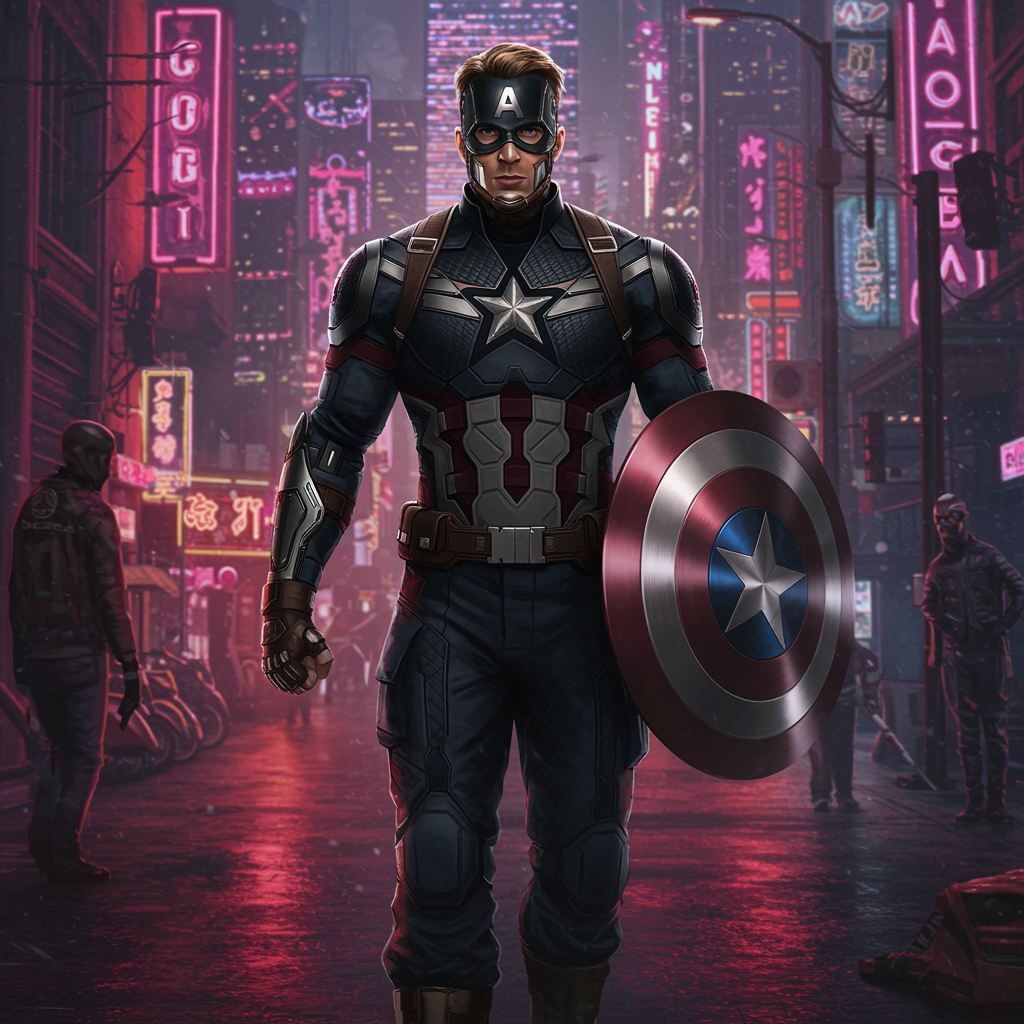 In a dystopian near-future cityscape where neon lights flicker against towering skyscrapers, an altered version of Captain America, now clad in a sleek, dark cybernetic suit, navigates the gritty streets of Night City. His once iron-clad moral compass has skewed towards tyranny, wielding a reprogrammed vibranium shield with advanced tech enhancements. This shadowy figure is feared by many as he enforces his own brand of justice, his eyes glinting with a blend of idealism and corruption amidst the chaotic urban sprawl. In the underbelly of the city, rumors spread of his cybernetic enhancements, rumored to push his strength and intellect beyond human limits, as he plots to seize control in this high-tech, shadowy world, where loyalties shift as frequently as the digital currency flowing through its veins.