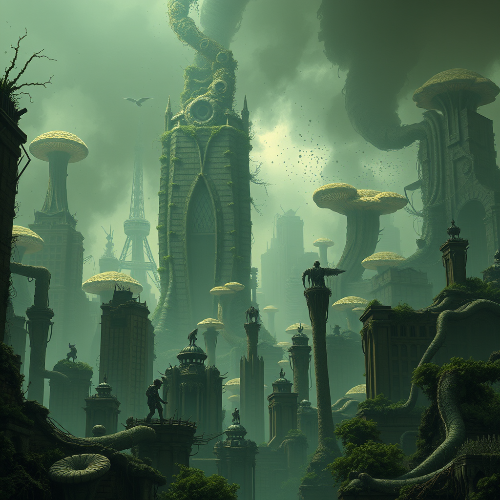 In a dystopian world where the landscape is dominated by the fungal grip of a mutated mycelium, the once-thriving metropolis now lies under the eerie control of an insidious species known as Necromyces. Buildings crumble beneath the weight of creeping tendrils, as spores drift eerily through the stagnant air, creating an environment both foreboding and strangely beautiful. Survivors navigate the labyrinth of skyscrapers turned into spore-spewing towers, evading creatures whose wills have been usurped by the pervasive fungus. This living organism weaves its way into every crevice of the city, its influence transforming the urban environment into a perilous echo of nature's reclaim. Amidst the ruins, pockets of humanity struggle to adapt and endure, as the once-bustling city is consumed by the relentless spread of Necromyces.