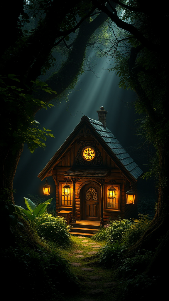 In a fairy tale wonderland, a mystical grove emerges, enveloped in nature's embrace with a small, enchanting wooden house at its heart. The setting is a dark, shadowy forest where the delicate balance of light and shadow creates an aura of mystery and allure. Lush, verdant foliage stretches symmetrically around the house, as if nature itself is cradling this magical abode. The house, with intricate carvings and adorned with ethereal designs, stands beautifully illuminated, casting a gentle glow that cuts through the darkness. Its warm light spills from windows and doorways, enhanced by lanterns that hang like suspended jewels, bathing the surroundings in a soft bloom. Rays of light pierce through the canopy above, creating a dance of illumination and shadow on the forest floor. The ambient occlusion adds depth to every nook and cranny, highlighting the incredible details of this photorealistic haven. Captured with cinematic grandeur, this raw photo portrays a scene of enchanting beauty, where magic weaves through the air and every element harmonizes in a surreal, dreamlike tableau.