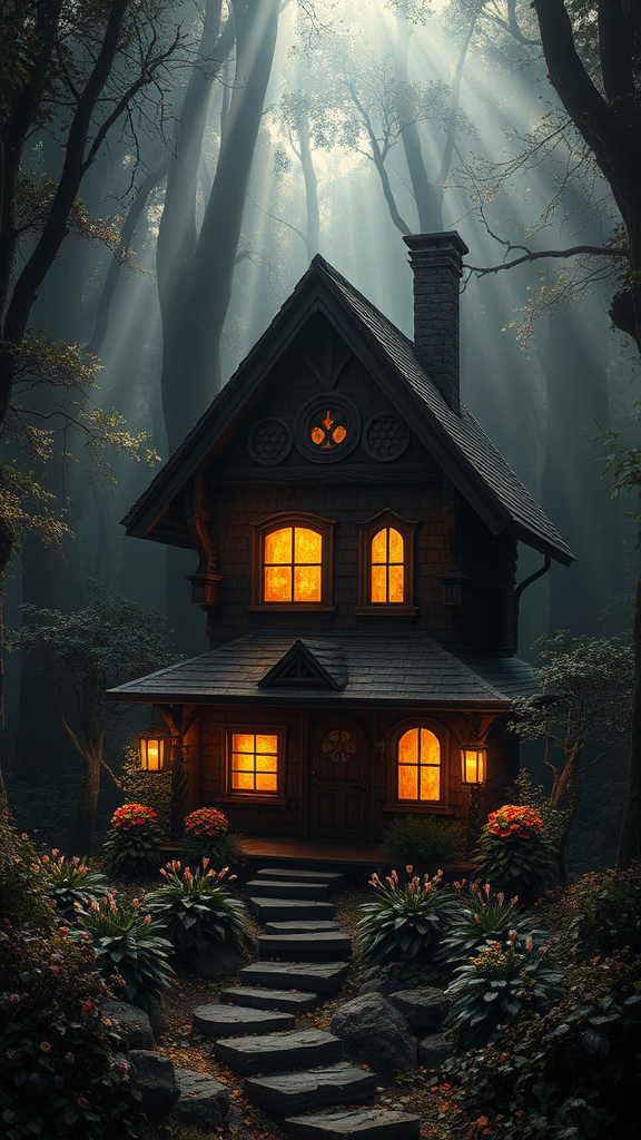 In a fairy tale wonderland, an enchanting forest thrives with lush nature, embraced by a mysteriously dark yet captivating ambiance. Nestled at its heart stands a small, magical wooden house, glowing warmly amidst the shadows. This dwelling is an architectural marvel, incredibly detailed down to the finest grain, with ethereal light streaming through ornate windows and hanging lanterns casting gentle glows. The symmetrical landscape around the house is a blend of elegant forestry and delicate blooms, creating a harmonious balance between man-made wonder and natural beauty. Rays of light pierce through the canopy, illuminating the scene with ethereal beams, adding to the cinematic and photorealistic feel of this magical realm.