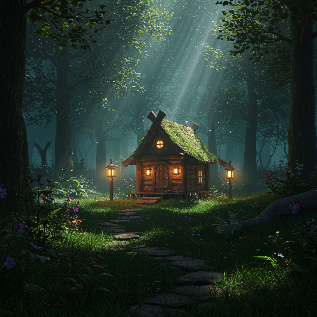 In a fairy tale wonderland filled with enchanting flora and shimmering dew, lies a small, magical wooden house nestled at the heart—a marvel of architectural wonder, bathed in the gentle glow of lanterns. The surroundings are cloaked in a mystical, dark ambiance, yet the house itself emanates a warm, inviting light, casting delicate shadows across the verdant land. This symmetrical scene is a breathtaking vision of natural beauty, where every detail is rendered with astounding clarity. Light rays dance through the trees, illuminating the house's intricate carvings and moss-covered roof, creating a scene of stunning photorealism. The ambient occlusion enhances the depth and texture, immersing you in this cinematic tableau, where every beam of light and bloom of color tells a story of magic and wonder.