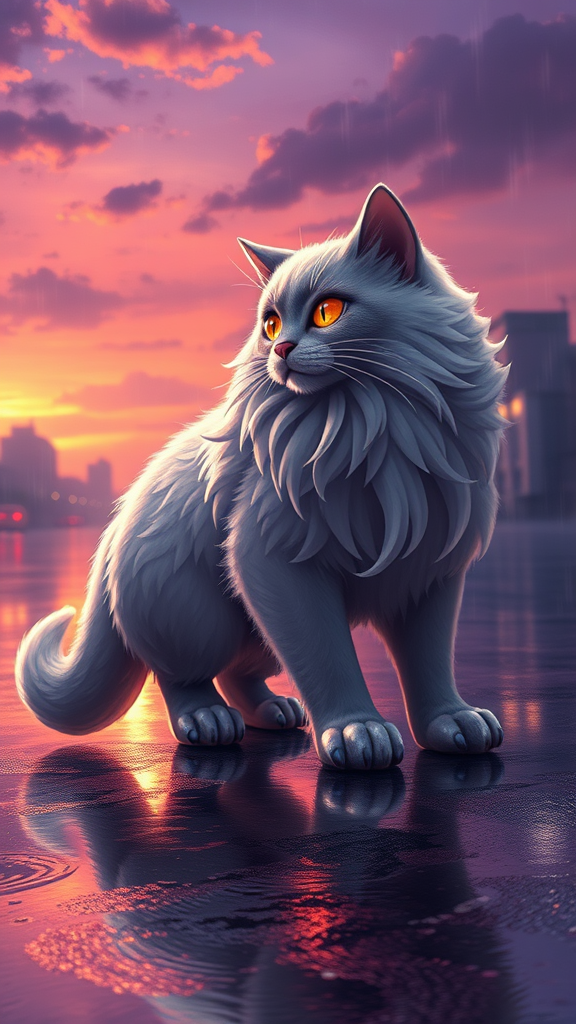 In a fantastical fusion of nature and technology, envision a majestic hybrid creature that merges the grace of an Angora cat with the cutting-edge design of a sleek Porsche 911. This extraordinary being boasts a feline frame enveloped in luxurious, flowing fur that seamlessly integrates with sleek, aerodynamic car elements. Its body glimmers with glossy metallic textures and curved panels that reflect the surrounding light. Its eyes resemble glowing headlights, casting a gentle but piercing gaze. The paws are a marvel of engineering, resembling finely tuned wheels or sophisticated mechanical components, artfully balancing the organic with the automotive. The setting is a mesmerizing animated world at dusk, where the sky explodes in dramatic shades of purple and orange as the sun sets. City lights shimmer and flicker in the background, reflecting off the glistening, rain-soaked streets. The scene is painted with vibrant colors and fluid brushstrokes, capturing an atmosphere of awe and serenity reminiscent of Makoto Shinkai's evocative style, inviting viewers into a world where wonder and tranquility coexist.