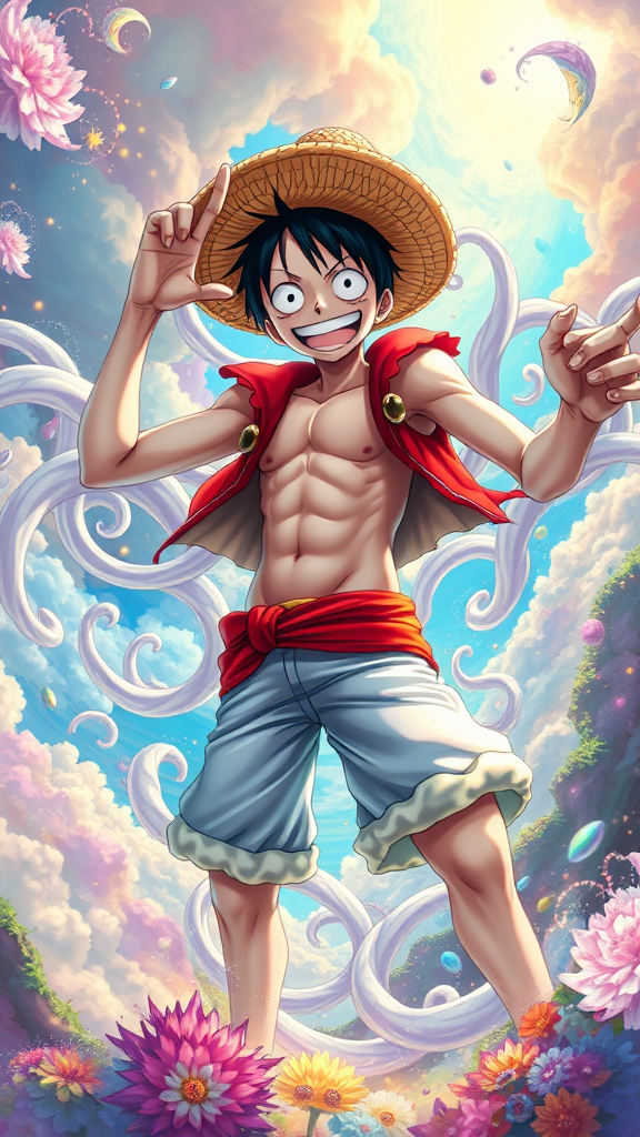 In a fantastical world bursting with color and whimsy, the legendary pirate Luffy from One Piece is captured in a moment of pure hilarity and awe. Exhibiting his extraordinary elasticity, Luffy's Gear 5 transformation as the mythical God Nika takes center stage. His form is pristine white, an otherworldly glow emanating from his skin, while every rubbery feature is magnified to comical proportions. His arms and legs stretch and twist with outrageous exaggeration, creating an intricate pattern of loops and spirals that defy logic. The scene is alive with vibrant hues and dynamic shapes, adding to the playful chaos. Luffy's face is a portrait of mischief, his eyes wide with joy, and his trademark straw hat perched at an impossible angle on his head. This moment of unrestrained elasticity is set against a backdrop of swirling clouds and fantastical landscapes, where reality bends and stretches in harmony with the pirate's own antics. It's a side-splitting, visually stunning masterpiece that captures Luffy's essence in a way that is both artistically sophisticated and delightfully absurd.