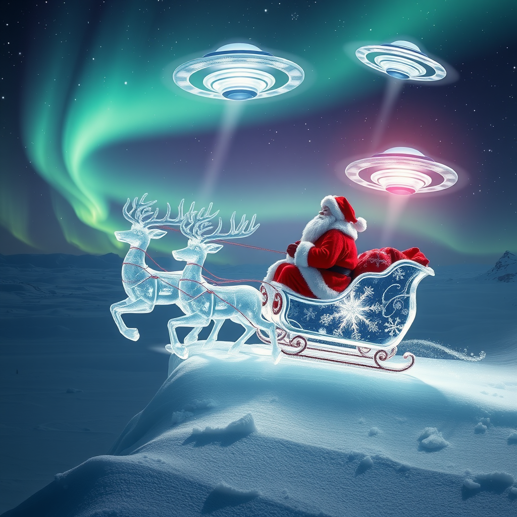 In a frosted wonderland, crystalline sculptures of Santa Claus ride an ethereal ice sleigh, drawn by translucent ice deer, soaring across a starlit sky. They engage in a dazzling aerial dance with luminescent UFOs, their shimmering trails interweaving beneath the aurora's glow in a celestial spectacle.