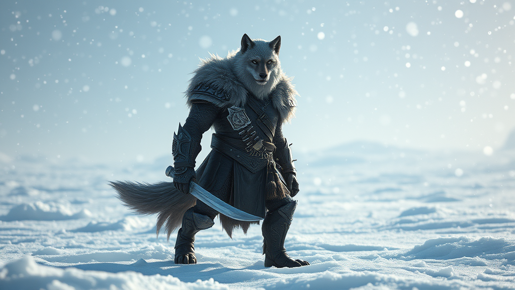 In a frosty expanse of dazzling snow, there stands a formidable wolf warrior with sleek, powerful features, an anthropomorphic figure exuding both savagery and nobility, straight out of a fantasy realm, perfect for a Dungeons & Dragons setting. This masterful work of art captures a realistic figure in exquisite detail, with hyper-detailed textures and cinematic lighting that adds depth and drama, set in a mesmerizing product shot that highlights every aspect of this incredible creature, rendered in stunning 32k ultra-high-definition resolution, in a portrait aspect ratio for immersive storytelling.