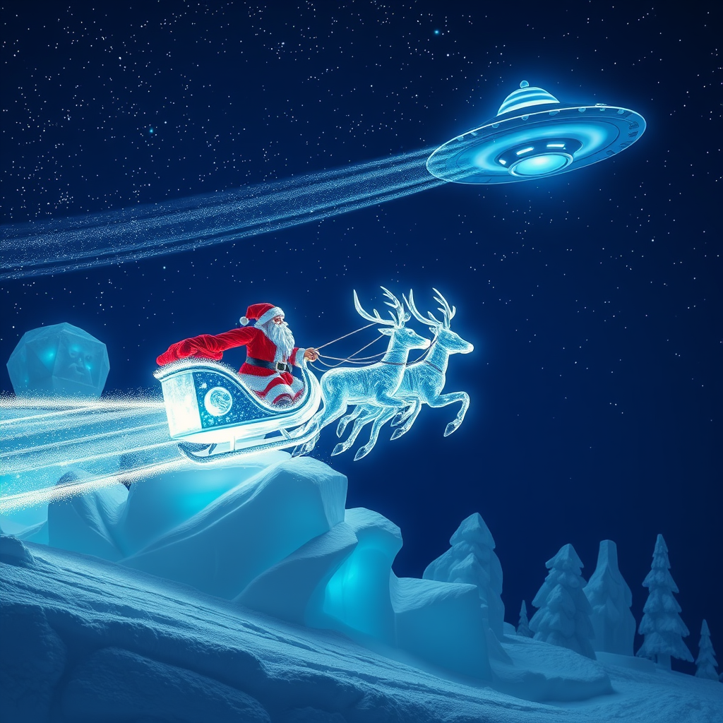 In a frosty fairytale realm, shimmering ice sculptures depict a majestic Santa in an ethereal ice sleigh drawn by sparkling ice deer, soaring through the starlit sky in an epic chase with a mysterious UFO, their trails leaving a glimmering tapestry of frosty magic across the night.