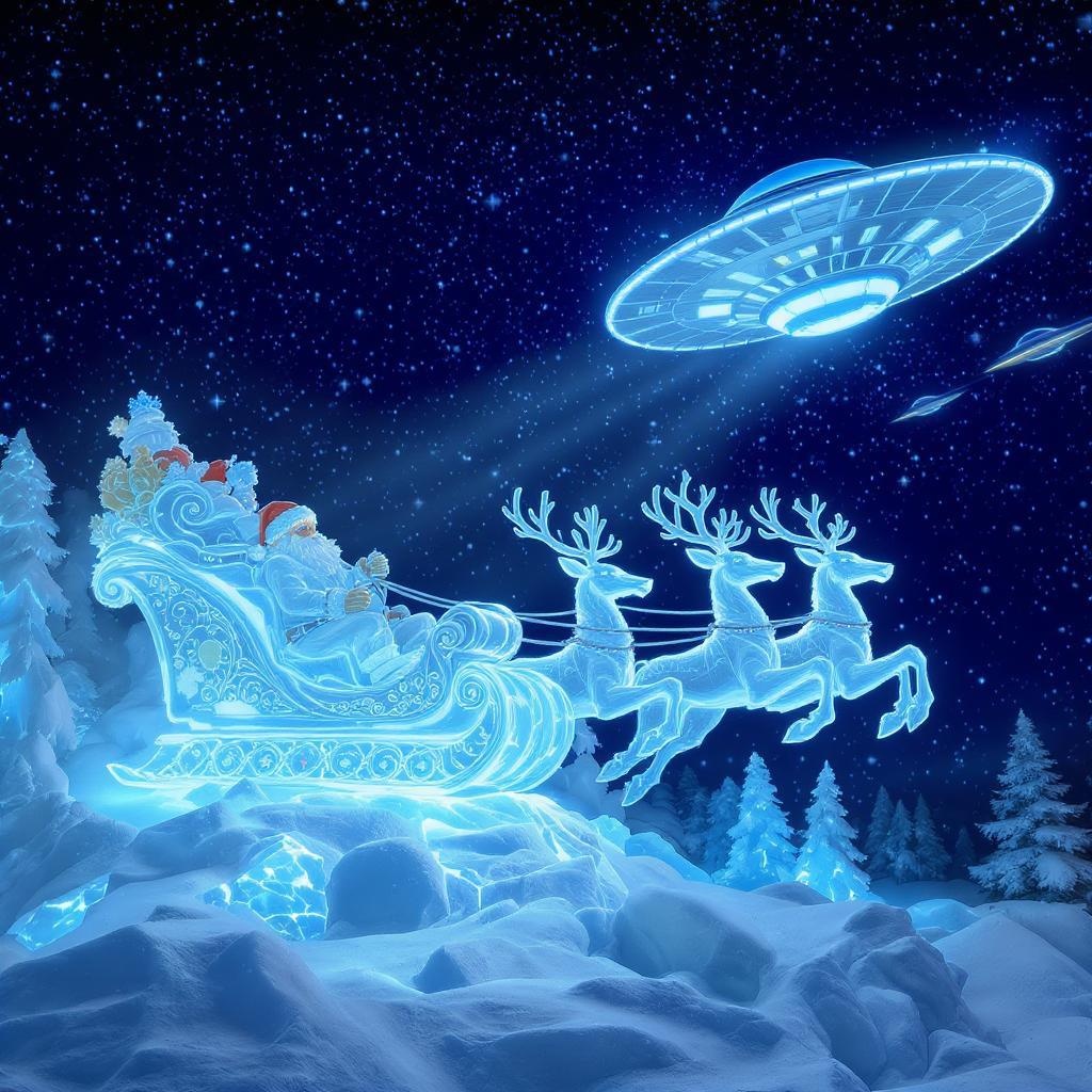 In a frozen wonderland, enchanting ice sculptures depict Santa in an intricately carved sleigh of shimmering ice, pulled by elegant ice deer soaring through the starry night sky. Above them, an unexpected spectacle unfolds—a thrilling chase as these ethereal ice figures engage in a mesmerizing dance with a sleek, glowing UFO darting amongst the clouds. This magical scene captures a harmonious blend of fantasy and the unknown, where holiday magic meets cosmic marvels.