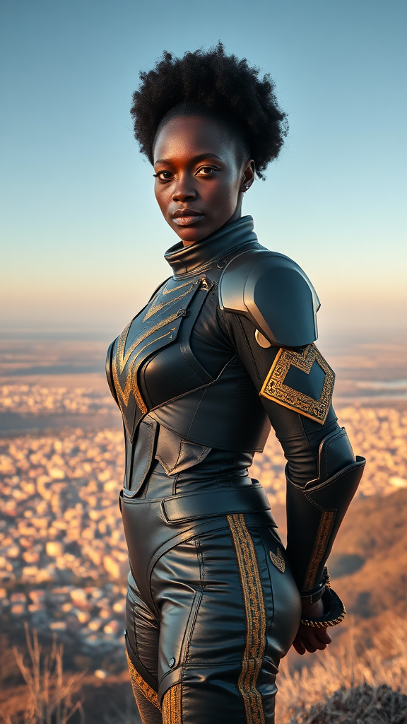 In a future inspired by Afro-futurism, a striking Bissau-Guinean woman stands as a commanding figure in the 24th century. She's a space captain, captured through the lens of a Cinestill Hasselblad 85 mm camera that aligns with the Golden Ratio, emphasizing her striking features and the strength she embodies. She gazes directly at the camera, standing atop a hill overlooking the majestic Fouta Djallon. Her presence is accentuated by her Vibranium armor, which is elegantly adorned with a black and gold kente cloth design. Her posture—hands behind her back in a stance of authority—reflects her seven-year journey patrolling the outer reaches of the Milky Way. The landscape behind is a cityscape reminiscent of Wakanda, bathed in the golden hour light that highlights her skin and armor, creating a warm and heroic atmosphere. Influences from films like "Interstellar" and "Black Panther" blend seamlessly under the visionary direction of Ava DuVernay, bringing forth a photorealistic, epic, and intimate portrayal of a warrior's homecoming.