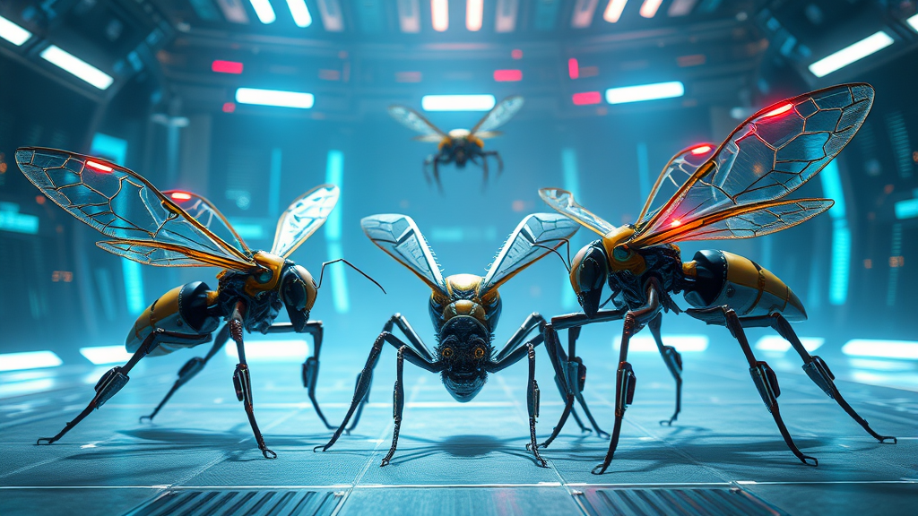 In a futuristic arena, five hyper-realistic robot insects engage in a thrilling battle, their clash a re-imagined representation of the ancient struggle between the Wasp and the Spider. These cyber-insects, with bio-mechanical precision-engineered bodies, display an array of metallic, iridescent cyber-wings that shimmer under dramatic lighting. Their intricately designed robotic legs move with calculated precision, highlighting the delicate balance between organic mimicry and technological innovation. The scene is set in a hyper-futuristic digital realm, where metallic and translucent elements intertwine, creating a captivating spectacle. The narrative unfolds with intense energy, as each cyber-insect maneuvers with purpose, embodying the eternal dance of predator and prey amidst a landscape of ornate mechanics and evolving strategies.