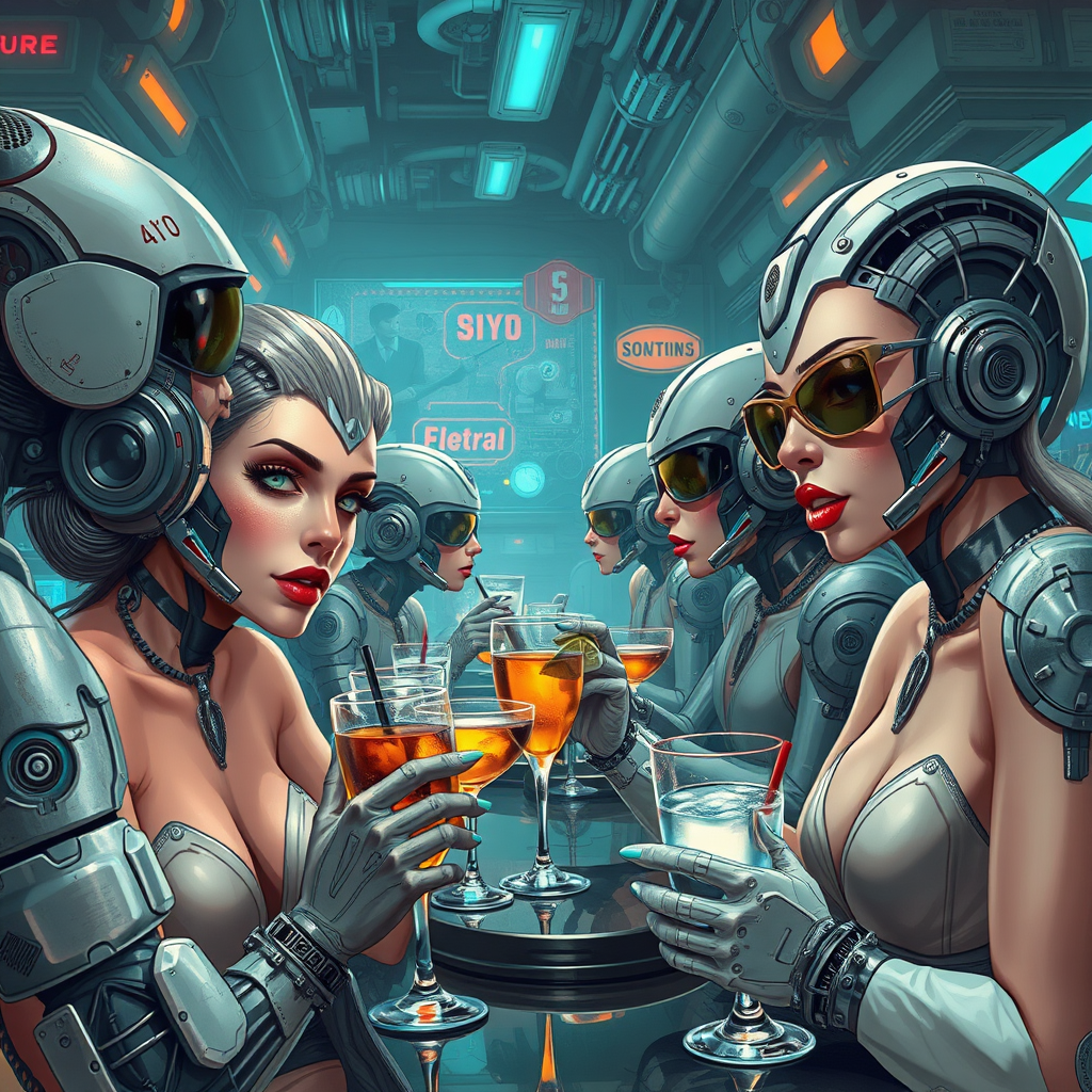 In a futuristic bar setting, futuristic patrons indulge in drinks, surrounded by robotic and cyborg entities showcasing intricate mechanical and sci-fi details. The scene is rich in hyper-realistic detail and cinematic composition, reminiscent of the art styles of Federico Pelat and Jan Urschel, suitable for showcasing on ArtStation. The artwork displays elements of drawing, painting, and cel-shading, with vibrant makeup and lipstick adding bold splashes of color, capturing a lively and immersive atmosphere.