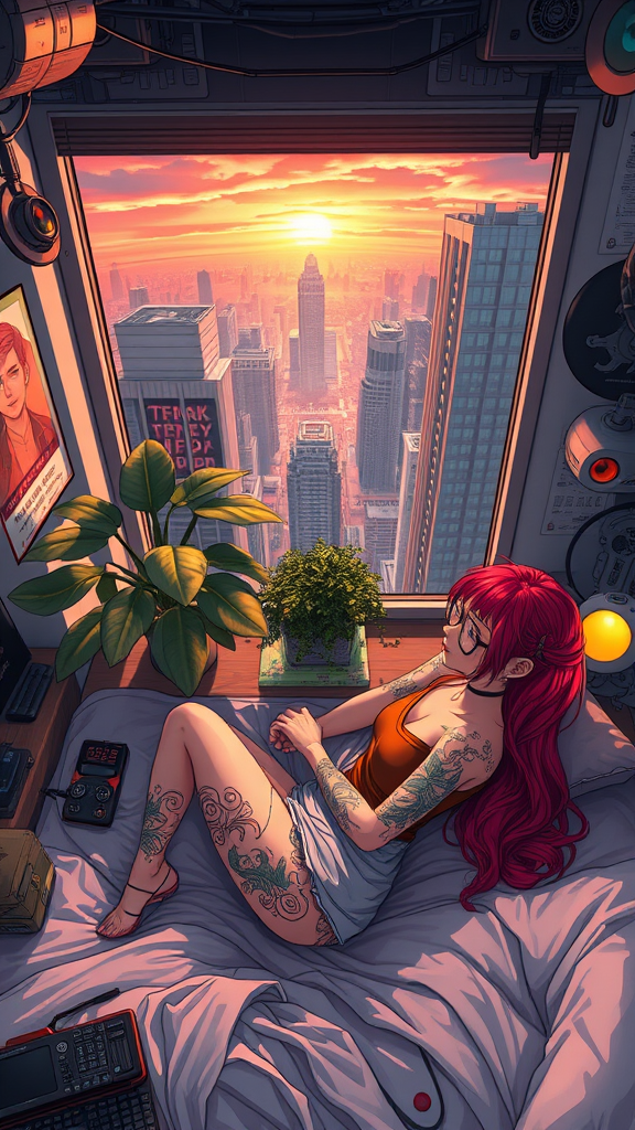 In a futuristic cityscape inspired by Ghost in the Shell and Room 2077, a young woman with vibrant red hair and intricate tattoos reclines on her bed, viewed from above. She wears stylish glasses, and a small robotic assistant hovers nearby. The room is cluttered with mechanical gadgets, and a lush plant by the window frames a breathtaking sunrise over towering skyscrapers. The walls are adorned with atmospheric and aesthetic posters, contributing to the ultra-detailed environment. This scene, reminiscent of anime, captures the essence of a technologically advanced yet artistic world.