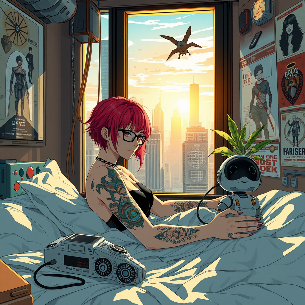 In a futuristic cityscape reminiscent of "Ghost in the Shell," a young woman with vibrant red hair and intricate tattoos, wearing stylish glasses, reclines on a bed. A small robotic assistant hovers nearby, surrounded by an array of mechanical objects. Sunlight streams in through a window adorned with a lush plant, revealing the skyline of towering skyscrapers bathed in the glow of dawn. The room's walls are adorned with atmospheric and aesthetic posters, adding to the ultra-detailed setting. The scene exudes an anime-inspired essence, merging high-tech elements with a touch of nostalgia.