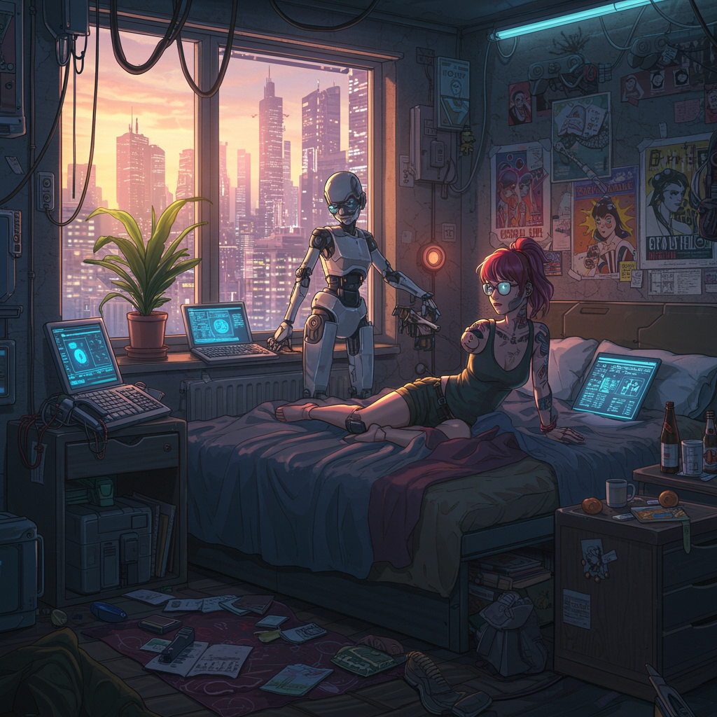 In a futuristic cityscape reminiscent of Ghost in the Shell, a young woman with vibrant red hair and intricate tattoos relaxes on a bed in Room 2077. Her stylish glasses reflect the ambient glow of neon lights, while her robotic assistant hovers nearby, attending to her in the cluttered yet organized space filled with mechanical gadgets. A verdant plant sits on the windowsill, contrasting with the towering skyscrapers outside, silhouetted by the rising sun. The walls are adorned with atmospheric posters, creating an aesthetic blend of technology and art. This anime-inspired scene is ultra-detailed and rich with countless elements, merging humanity with the digital future.