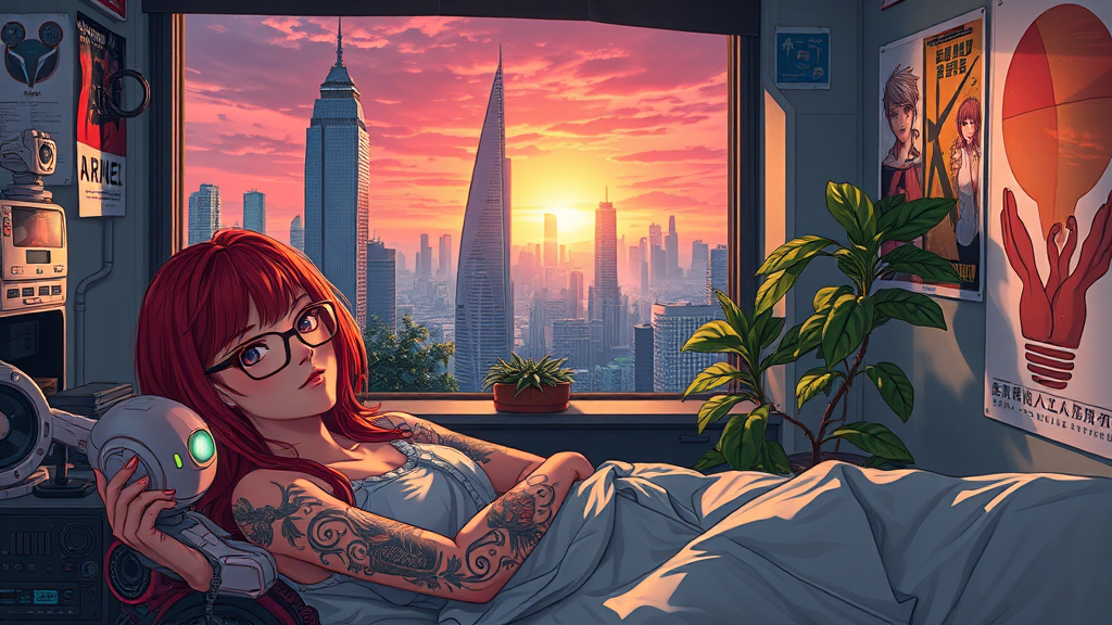 In a futuristic cityscape reminiscent of Ghost in the Shell, a young woman with vibrant red hair and intricate tattoos reclines on her bed. Her glasses glint softly in the rising sunlight, as her small robotic assistant hovers nearby, casting a gentle glow. The room is cluttered with mechanical gadgets and tech devices, creating an ambience of advanced innovation. A lush plant thrives on the windowsill, framing a breathtaking view of towering skyscrapers against the backdrop of a vibrant sunrise. Posters adorn the walls, adding an atmospheric and aesthetic touch, each one meticulously detailed, evoking the essence of anime. This scene is a fusion of high-tech futurism and personal expression, rich with complexity and imagination.