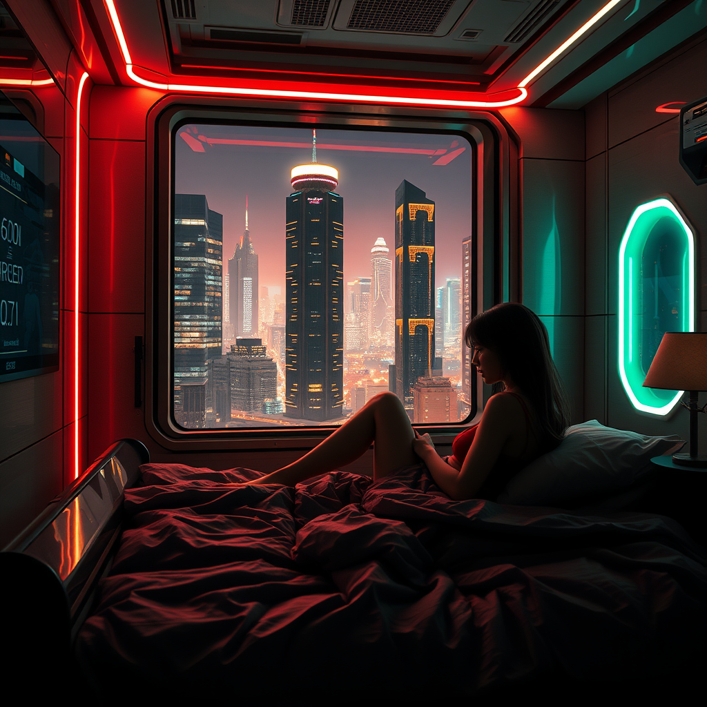 In a futuristic girl's room, the scene exudes a cyberpunk vibe with neon lights casting a glowing ambiance. The setting is sharply focused, photorealistic, as if crafted with the precision of Unreal Engine 5. A girl lounges on her bed, her silhouette framed against a window revealing a skyline dominated by towering skyscrapers. The room is meticulously detailed, embodying a sci-fi aesthetic that's both dystopian and stunningly beautiful. Iridescent gold accents shimmer with cinematic lighting, creating a contrast of dark elegance. The overall atmosphere reflects a sense of artistic depth akin to deviantart influences, with an emphasis on high detail and sharp focus. The environment is all-encompassing, with intrigue in every corner, ensuring a striking visual experience.