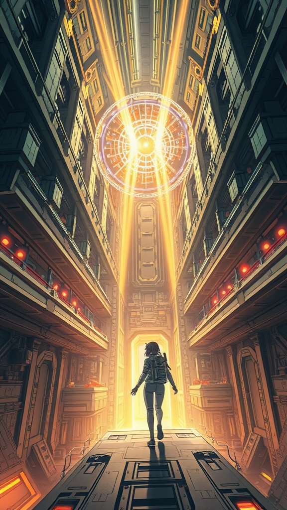 In a futuristic multi-story spaceship interior reminiscent of Tsutomu Nihei's style from Sidonia no Kishi, a girl in a highly detailed space suit navigates the vast, cavernous halls. The setting displays elements of gigantism, with towering structures and intricate machinery enveloping the space. At the very center, a massive laser generator emits beams of light towards the sky, creating a spectacle of illumination and energy clots. The atmosphere is charged with acceleration and speed, highlighted by the flashes of light from the laser. The scene is rendered in hyper-detailed anime style, merging traditional manga graphics with an 8K high-definition super-resolution finish, providing a first-person perspective that immerses you in this sci-fi world.