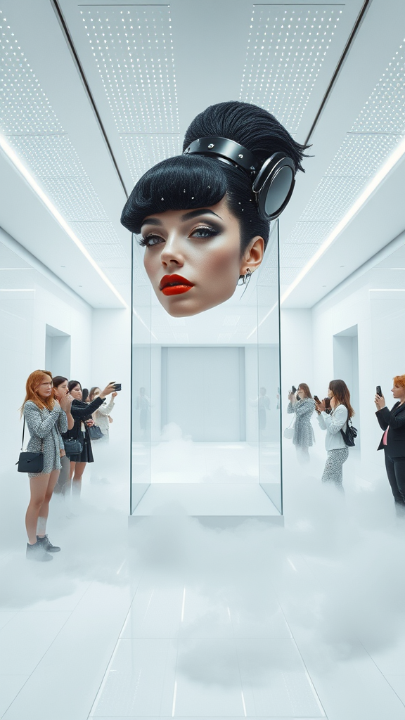 In a futuristic museum hall, a soft, ethereal haze of smoke drifts lazily through the air. The entire room is a dazzling white, creating an almost disorienting purity that envelops everything from the floors to the walls. Overhead, the ceiling sparkles with long, continuous LED strips, their glow subtly absorbed by the mist on the floor, causing the light to diffuse into an otherworldly atmosphere. This surreal space lacks doors or windows, amplifying its mysterious vibe. In the center, a minimalist glass display case houses a mesmerizing spectacle—a floating female head with striking red lips, captivating editorial makeup, and shimmering metallic highlighter. Her avant-garde wig features long, black textured hair with a short fringe, adorned with tiny metallic pins. It's sculpted into futuristic, architectural shapes and intricate geometric designs. There is no body to be seen, just the striking, levitating visage. Around the display, elegantly clad guests in high-fashion, futuristic attire stand in reverence, snapping photos with their devices. Their outfits boast bold, sculptural silhouettes, reflective metallic fabrics, exaggerated shoulders, high-neck collars, and intricate laser-cut details. Asymmetrical designs and visor-like glasses are accentuated by glowing accessories and gravity-defying structured garments. The bright flashes from their cameras dance off the glass, creating a dazzling interplay of light. This scene is a captivating blend of eerie surrealism, high fashion, and advanced technology, resembling a high-end fashion editorial from a distant future.