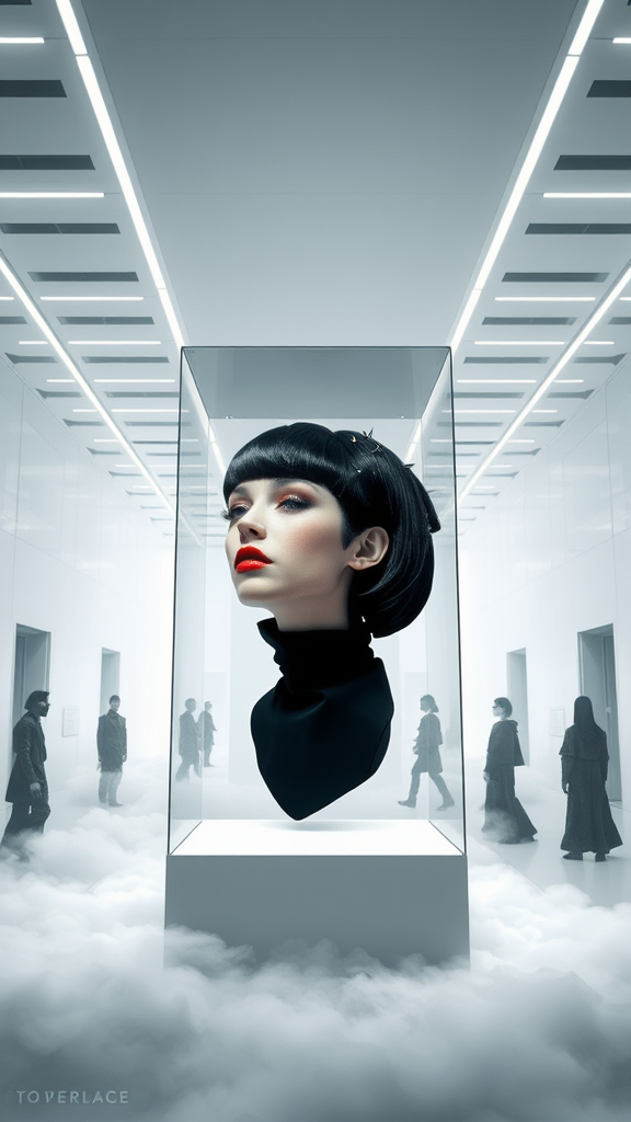 In a futuristic museum hall filled with a soft, drifting haze of mist, the entire space envelops visitors in an overwhelmingly pristine white, almost dizzying in its purity. The ceiling is adorned with endless lengths of continuous LED strips, their glow gently mingling with the swirling mist on the floor, casting an otherworldly, diffused lighting throughout the space. Devoid of doors or windows, the room exudes an eerie yet captivating atmosphere. At its center stands a minimalist glass showcase. Inside, a remarkable levitating female head captivates attention, showcasing bold red lips, editorial-style makeup, striking contouring, and shimmering metallic highlighter. Her extravagant avant-garde wig, crafted from black, elaborately textured hair with a short fringe, is adorned with tiny metallic pins and sculpted into ultra-modern, geometric forms. The head magically floats, with only the hair visible, evoking a disembodied, strikingly futuristic form. Surrounding the display, men and women draped in avant-garde, high-fashion attire stand in awe, enthusiastically capturing the wig with their smartphones. Their ensembles boast daring, sculptural silhouettes, reflective metallic textiles, exaggerated shoulders, high-neck collars, intricate laser-cut details, and asymmetrical designs. Some accessorize with visor-like glasses, illuminated jewellery, and gravity-defying structural garments. The bright flashes from their cameras dance across the glass, creating a mesmerizing play of light. This enchanting scene weaves together high fashion, advanced technology, and a mysterious allure, merging futuristic aesthetics, editorial flair, and avant-garde fashion elements to evoke the sensation of a high-end fashion editorial from a distant future.