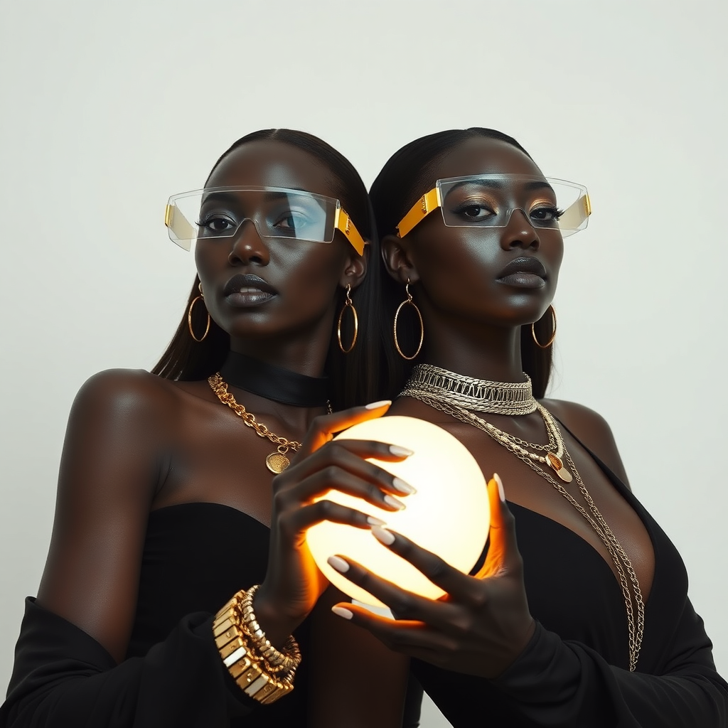 In a futuristic photoshoot for Vogue magazine, two women with strikingly contrasting skin tones, one with deep black skin and the other with creamy white skin, pose elegantly against a soft matte white background. Adorned with exquisite gold jewelry that catches the light, their sleek black outfits meld minimalist fashion with avant-garde flair. A thick neon transparent band crosses their eyes, paired with unusual, futuristic eyewear. They hold a softly glowing orb, casting a gentle, warm light that enhances the serene and mystical atmosphere of the setting. This image captures the essence of modern minimalism, timeless elegance, and artistic innovation, embodying a new, unknown style from the year 2066.