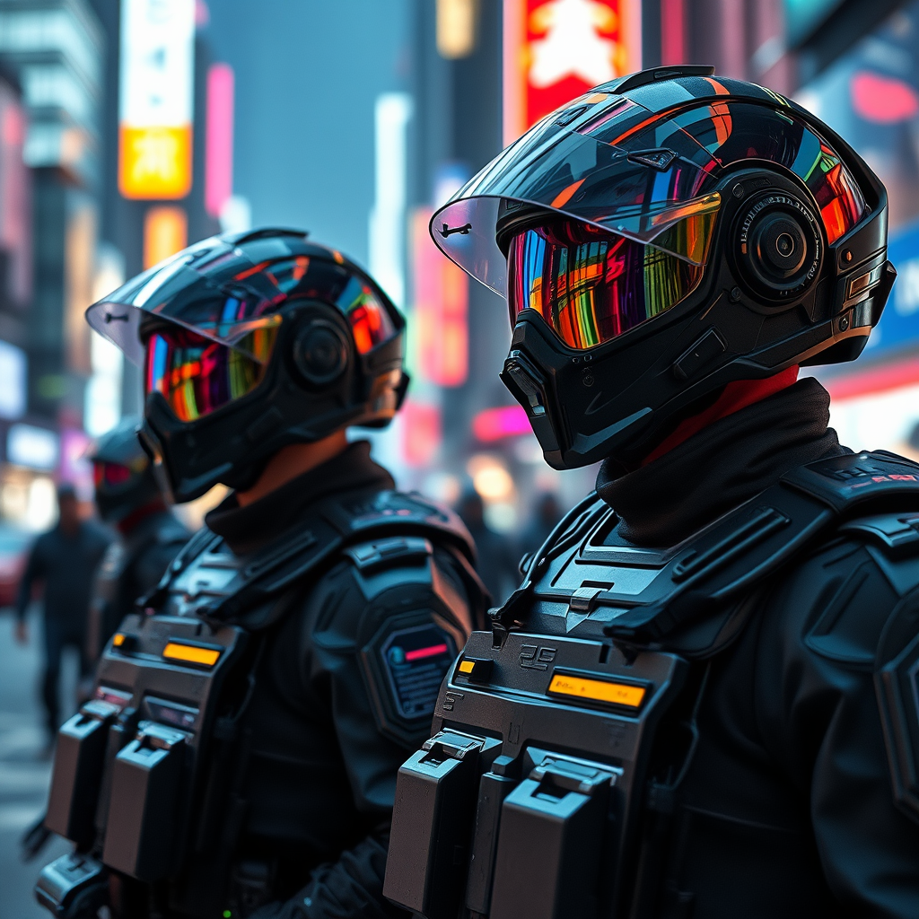 In a futuristic urban landscape, law enforcement officers patrol the streets clad in sleek, advanced riot gear with a blend of lightweight and heavy-duty elements. Their helmets, intricately designed with high-tech features, gleam with the reflections of vibrant neon lights. The scene is a captivating display of reflection mapping, capturing the city’s electric essence. Under dramatic cinematic lighting, the atmosphere becomes intensely photorealistic, akin to an 8k masterpiece rendered with unreal engine precision. Depth of field enhances the urban depth, while subtle cybernetic enhancements on the officers add an intriguing twist to their formidable presence.