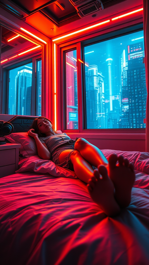 In a girl's room with a cyberpunk vibe, neon lights cast an iridescent glow over the scene. The sharp, photorealistic focus brings to life the intricate design details akin to an Unreal Engine 5 creation. The girl lies on her bed, framed by a window revealing the towering skyscrapers of a dystopian city. The setting is a stunning fusion of sci-fi and deviantart aesthetics, with elaborate and highly detailed surroundings. Cinematic lighting illuminates the space, highlighting the interplay of deep shadows and gleaming highlights. The ambiance contrasts dark elements with subtle golden hues, evoking both beauty and intrigue. Despite the sophisticated setting, some elements like hands and feet are imperfect, adding a raw, artistic touch to the composition. The overall atmosphere teeters between the futuristic elegance and a gritty, imperfect reality, crafting a vivid, imaginative narrative.