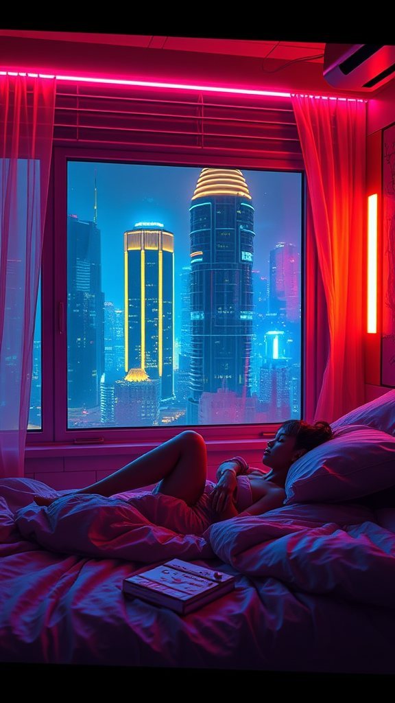 In a girl's room with a strong cyberpunk vibe, neon lights cast vibrant glows across the scene, capturing every detail in sharp focus as if rendered in Unreal Engine 5. The girl is peacefully lounging on her bed, with a window framing towering skyscrapers in the dystopian cityscape beyond. The atmosphere is a blend of sci-fi allure with iridescent gold accents highlighted by cinematic lighting. The room’s aesthetic is a stark contrast between stunning beauty and a subtly dark undertone. As the neon colors dance across surfaces, they illuminate the highly detailed environment, creating an immersive experience in a futuristic world.