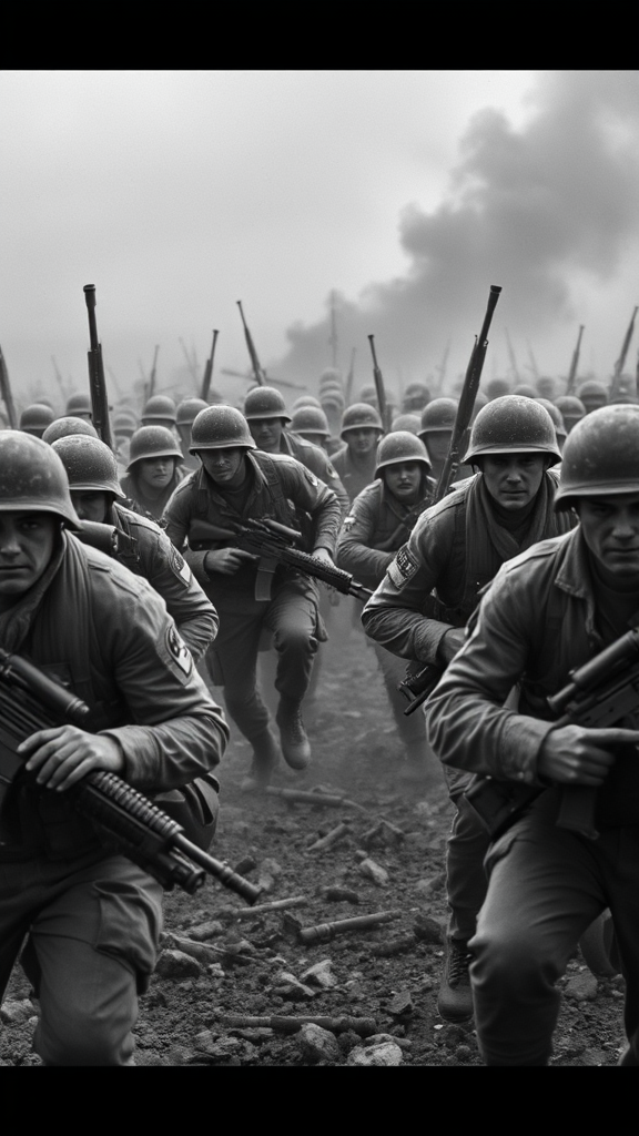In a gritty, monochrome battlefield, a group of diverse and resilient soldiers must navigate the chaos and unpredictability of war, relying on strategy, unity, and sheer determination to overcome overwhelming odds and emerge as an unbreakable unit of camaraderie and heroism.