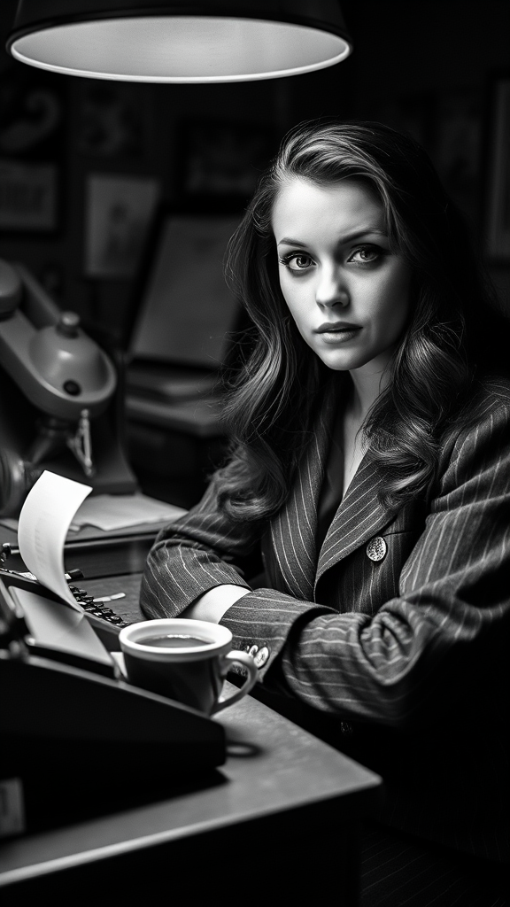 In a high contrast black and white film stock setting, the scene captures the essence of a 1940s Noir detective film. The most beautiful detective in the world, a stunning private investigator with long, shiny hair and captivating dark eyes, sits poised at her desk. Her detailed symmetrical face is accentuated by freckles and subtle makeup. She gazes intently, the eye focus creating an enigmatic aura. A cup of hot coffee steams beside her on the desk cluttered with a typewriter and a classic rotary phone. Dust particles dance in the dramatic rim lighting cast by an overhead ceiling lamp. Her slim figure is clad in pinstripe trousers, exuding sophistication and style synonymous with the era. The shallow depth of field blurs the background, emphasizing the detective's serene yet determined expression. Despite her soft appearance, there's an underlying tension portrayed through her posture, hinting at the complex cases she solves. All elements come together seamlessly, creating a timeless black and white photograph reminiscent of a classic detective story.