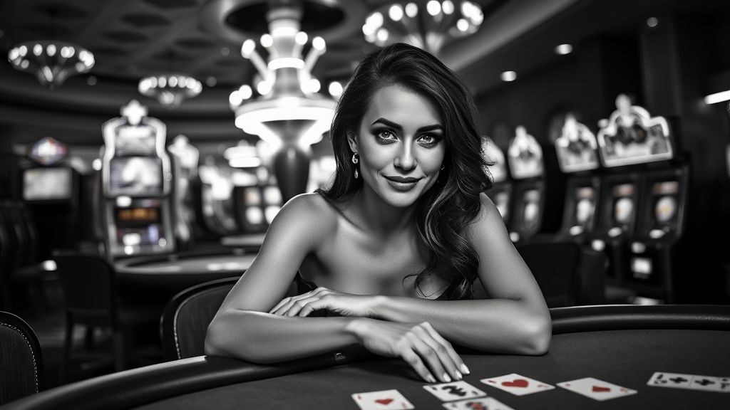 In a high contrast black and white scene, the most beautiful woman in the world poses with an enigmatic allure, seated gracefully on a blackjack table in the heart of Las Vegas. Her eyes, reflective and shadowed with perfectly applied mascara, draw attention, while her makeup enhances her classic beauty. Her delicate nose and radiant smile captivate the room. Rim lighting and dramatic chiaroscuro highlight her elegance against the lively backdrop of slot machines and playing cards. Inspired by the majestic impressionism of artists like Waterhouse, John Constable, and Jeremy Mann, the scene is both intricate and detailed, trending on platforms like ArtStation and CGSociety. The image retains elements of professional oil painting, with hints of modern style, capturing a femme fatale aura amidst the vibrant chaos of the casino, blending beauty with a touch of drama in a unique and unforgettable composition.