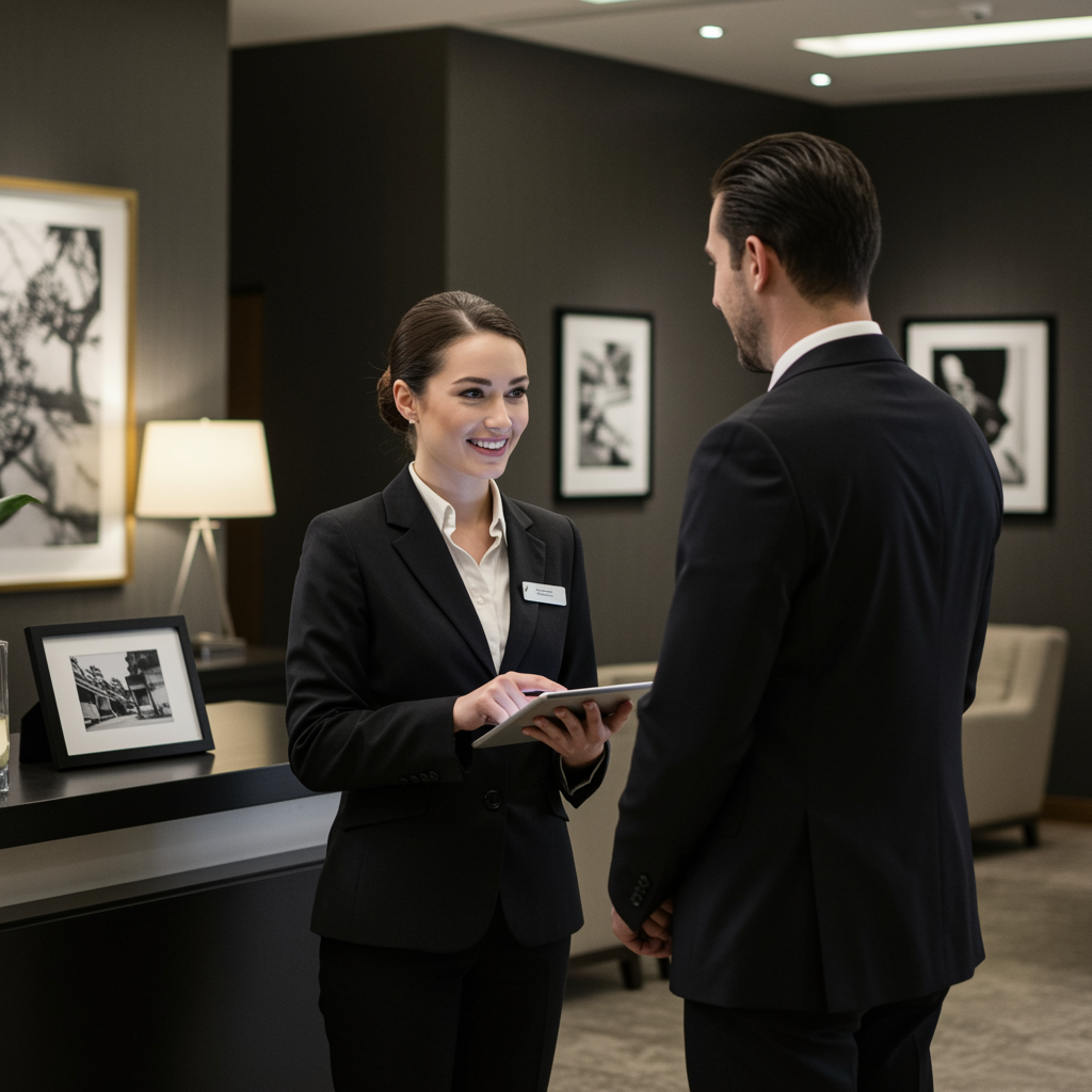 In a high-end hotel lobby, a female employee stands confidently in a tailored black blazer, her name badge prominently displayed, and a cream blouse peeking out underneath. Her hair is meticulously styled in a neat bun, projecting an image of professionalism. She holds a sleek tablet, its screen aglow, as she efficiently reviews information while beaming a friendly, professional smile at the male client beside her. The man, dressed in a sharp black suit and crisp white shirt, exudes a refined aura, his side profile encapsulating sophistication. Around them, the modern, upscale setting shines, adorned with contemporary art pieces and elegant decor that perfectly complements the polished ambiance. The thoughtful arrangement of photographs and abstract artwork on display adds an artistic touch to the environment. The lighting is subtle yet effective, casting a warm glow that enhances the overall luxurious atmosphere. The palette of black, white, and neutral tones envelops the scene, creating a cohesive and sophisticated business interaction.