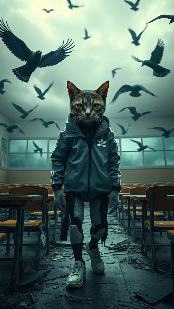 In a hyper-detailed, cinematic scene set in a damaged classroom filled with disordered tables and chairs, an anthropomorphic cybernetic cat with adorable yet eerie features struts confidently, clad in a stylish Adidas jacket and sleek sneakers. Crows hover ominously as the sky above shifts in a haunting blend of gray and green hues, casting an unsettling yet mesmerizing glow. The atmosphere is rich with a sense of horror and fantasy, balancing on the edge of creepy and captivating. The composition adheres to the golden ratio, maximizing visual impact in an ultra-wide, hyper-realistic representation of a world where whimsy intertwines with the hauntingly surreal.
