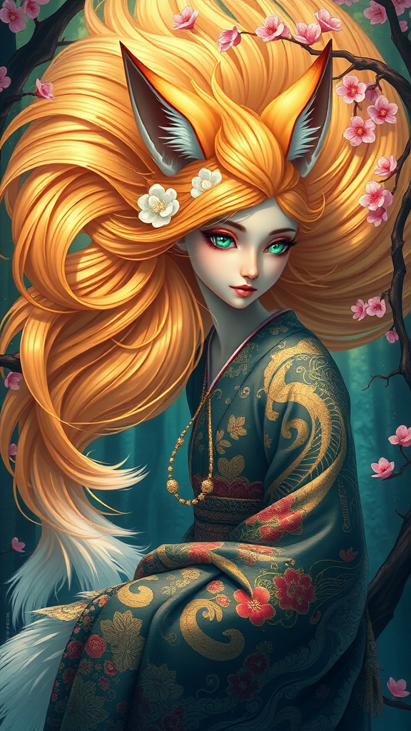 In a hyper-maximalist opus, the image of an extraordinary nine-tailed fox girl emerges within a mystical forest, exuding otherworldly grace. Her flowing hair, a molten gold hue, glows with internal brilliance. Her iridescent emerald eyes reflect ancient wisdom and playful mischief, capturing every onlooker's spirit. Her porcelain-like skin, adorned with intricate, subtly shifting cherry blossom designs, responds to the ambient light. The nine magnificent tails are embellished with patterns inspired by diverse art styles, creating a harmonious visual narrative. Her ornate kimono, influenced by traditional Japanese woodblock prints, displays exquisite detailing. The enchanted forest vibrates with vivid colors, blending elements of surrealism and fantasy. This epic creation inspires wonder, merging hyper-realistic rendering with intricate detailing and a seamless confluence of styles. It stands as a groundbreaking testament to the artist's mastery, drawing viewers into a realm where beauty and magic coexist. With exceptional attention to detail, it breaks visual boundaries, providing a timeless engagement with the extraordinary nine-tailed fox girl—an awe-inspiring embodiment of artistic brilliance.