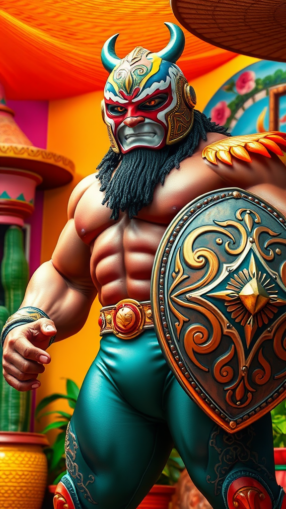 In a hyper-realistic photograph set amidst a vibrant and colorful Mexican-inspired environment, El Tigre Braum stands tall, showcasing his towering and muscular physique. The intricate details of his luchador mask are vividly portrayed, while his signature shield gleams with advanced lighting techniques. In a dynamic pose that highlights his agility, his fierce and determined expression is captured with precision, exuding strength. The photograph employs a bright and bold color palette with pops of orange and yellow, accentuating the lively and energetic essence of El Tigre Braum. Small creative modifications enrich the setting, enhancing the core concept with an added zest.