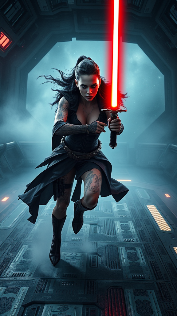 In a hyper-realistic portrait, a stunning and perilous Zabrak woman, Sith master with intricate tattoos, dashes across a spaceship deck wielding her crimson lightsaber with expert precision. Her movements ripple with intensity, cutting through the ethereal galaxy mist that surrounds her. She exudes an alluring yet formidable presence, amplified by the dark fantasy ambiance and scandalous posture that suggests untamed power. The composition captures her in full-bodied form using advanced CGI and 3D octane rendering, transporting viewers into a mesmerizing, 5D dimension scene directed with cinematic grandeur reminiscent of Zack Snyder's visionary style.