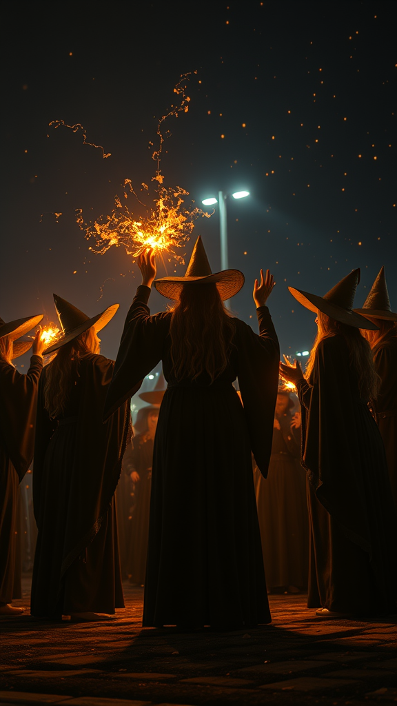 In a hyperrealistic cinematic scene, a coven of witches gathers, adorned in robes that shimmer with ember light, casting a supermassive spell that weaves magic and witchcraft into the air. The intricate dance of motion-capture technology captures the essence of their fluid movements, while lightcore elements in vivid detail illuminate their surroundings with a sense of epic light. Set against the dramatic backdrop of a night sky teeming with light pollution, the under-illumination casts an ethereal glow reminiscent of Blocksberg's legendary gatherings. The scene is enveloped in dramatic lighting, blending dark aesthetic tones with hyperdetailed features, shot in spectacular 8k UHD, delivering a CGSociety-quality visual experience that is both realistic and hyperdetailed.