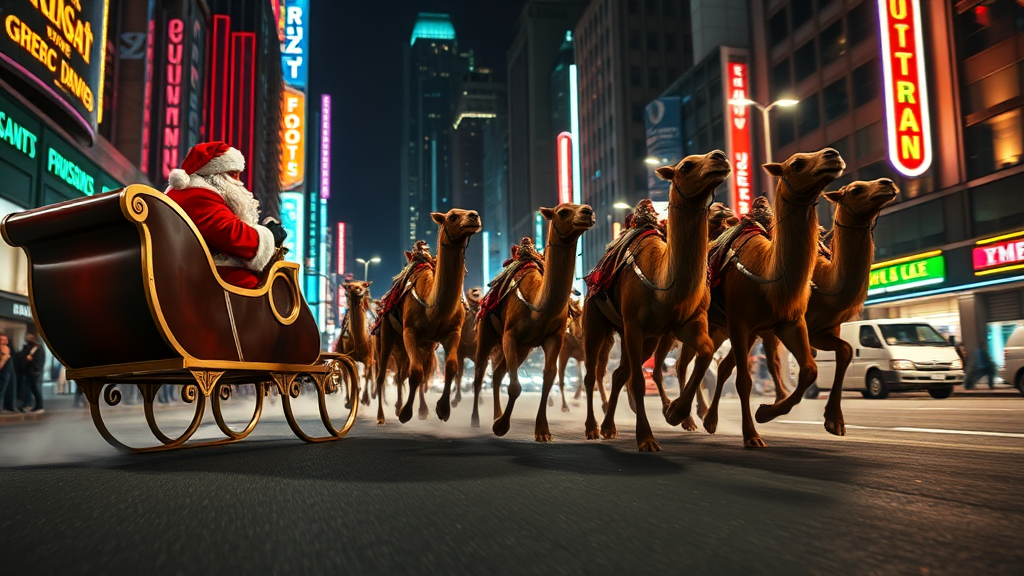 In a lively video sequence, Santa Claus and The 3 Wise Men engage in a thrilling race on a bustling city street at night. The scene begins with a close-up shot of Santa's iconic sleigh and the majestic camels, focusing on the reindeer and camels stamping the ground. Their neighs and snorts echo in the night air, setting an anticipatory tone. As the race begins, the camera switches to a wide shot, capturing the sleek profile of the sleigh and the powerful strides of the camels as they surge forward, leaving a mesmerizing trail of smoke and sparks. The camera follows their swift movements steadily, showcasing the vibrant urban backdrop. Neon lights cast colorful reflections over the polished surfaces of the sleigh and camels, adding a magical glow to the scene. The pace is exhilarating, emphasizing the excitement and intensity of the race. Smooth transitions between detailed close-ups and sweeping wide shots ensure the viewer is fully immersed in the action, maintaining the heart of the dynamic competition.