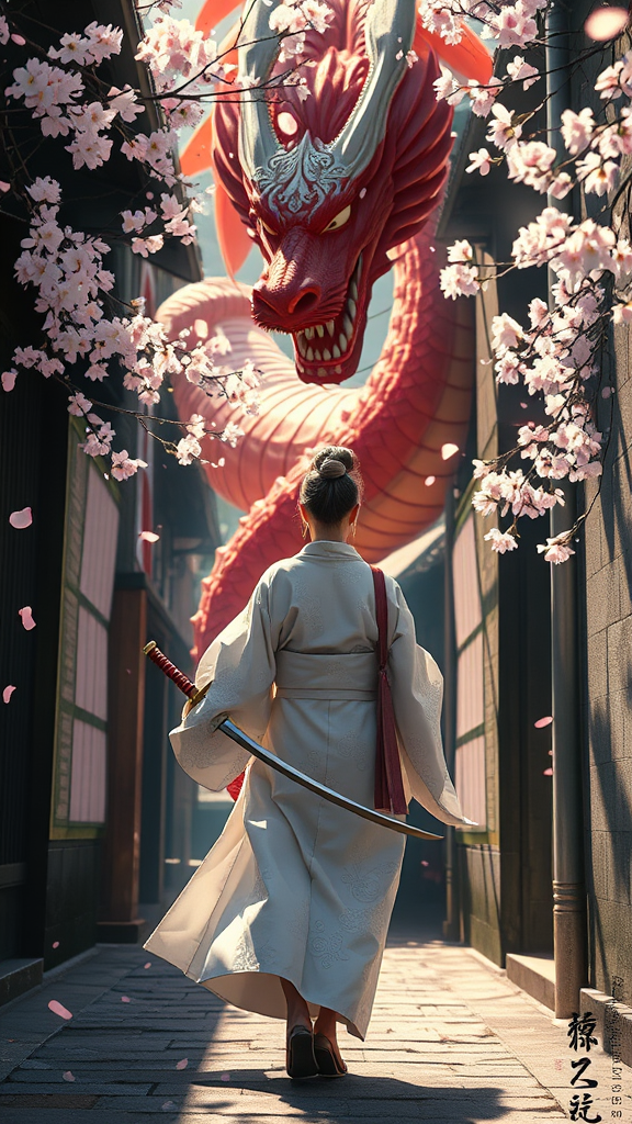 In a luminous white kimono adorned with intricate silver patterns, a figure gracefully wanders through the ancient, narrow streets of Kyoto, petals of cherry blossom swirling in the gentle breeze. The air is filled with their delicate fragrance as sunlight filters through the blossoms, creating a scene of ethereal beauty and dynamic interplay of shadows. In one hand, the figure holds a finely crafted katana, its blade shimmering with an understated elegance. Pausing before a majestic red dragon, its scales glinting with the glow of mythical fire, the scene captures a perfect blend of Studio Ghibli's enchanting style and the rich textures of the Edo period. The setting is an exquisite tapestry of ancient Japan, with vivid details and an atmosphere that blends fantasy with tradition.