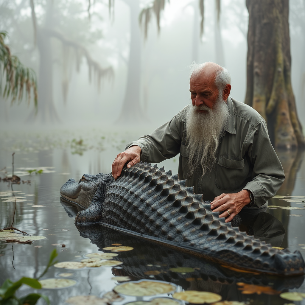 In a lush, misty swamp, an elderly man with a flowing white beard gently caresses the ridged back of his serene alligator, their friendship forged over years beneath the ancient cypress trees.