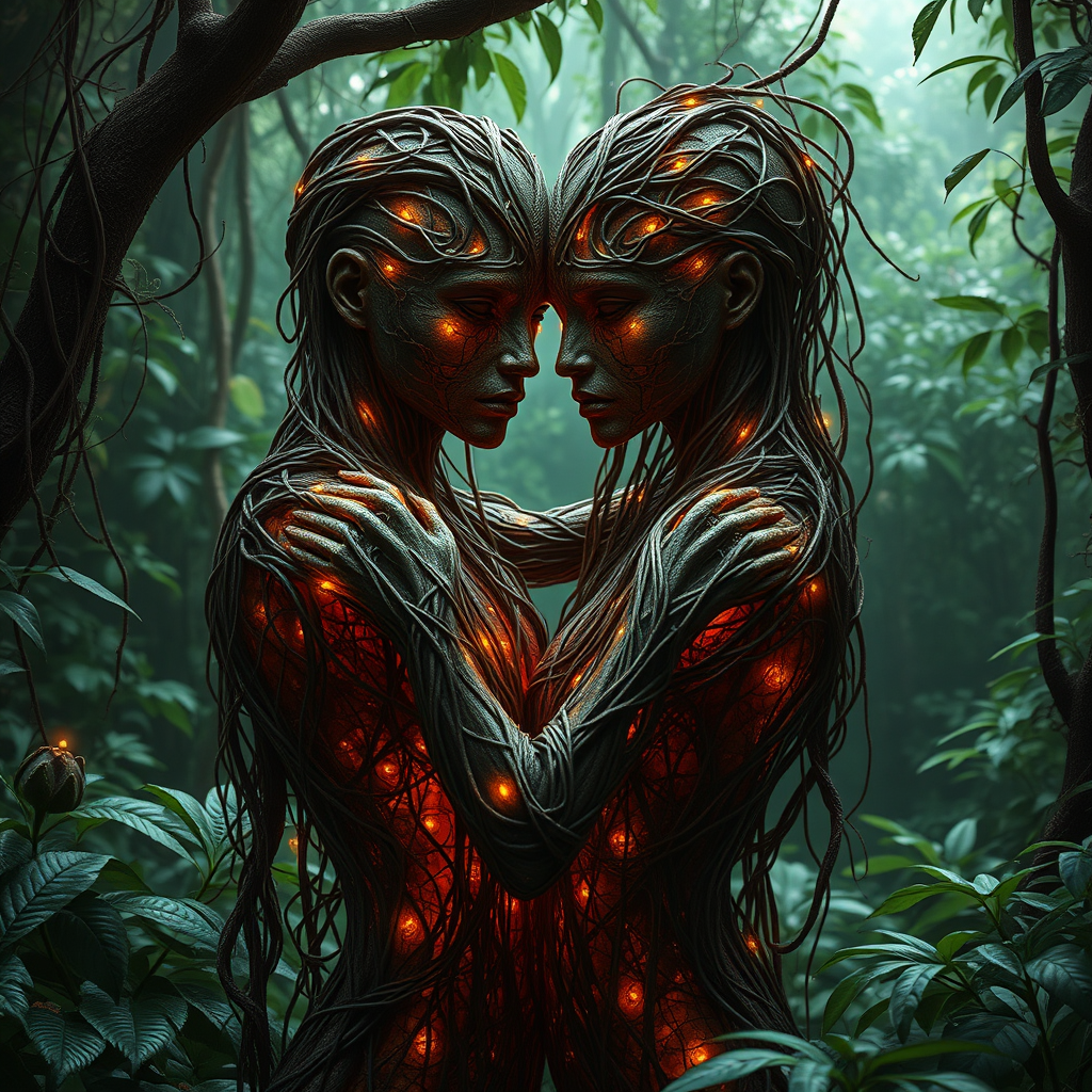 In a lush, mystical jungle, two ethereal figures made entirely of intertwining vines embrace each other. Their forms shimmer with a blend of earthcore and firecore energies, casting a warm, intricate glow around them. The detailed facial features, almost human-like, are soft yet defined, evoking a sense of deep connection and timelessness. The surrounding jungle is alive with the vibrant hum of nature, accentuating the figures' dark, elaborate design. The interplay of light and shadow creates a surreal, physically based rendering, adding depth and allure to the enigmatic scene.