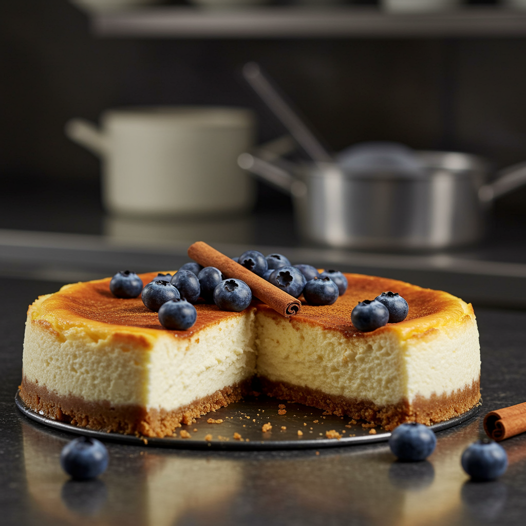 In a luxurious Michelin-star kitchen, capture an ultra-detailed scene of a decadent cheesecake adorned with fresh blueberries and a hint of cinnamon spice. The composition emphasizes the elegant presentation, with a masterful depth of field that brings the cheesecake into sharp focus against a softly blurred background. Natural light uplifts the sumptuous textures of the dessert, highlighting the creamy richness and vibrant colors, while subtle reflections dance across the polished kitchen surfaces, adding a touch of sophistication.