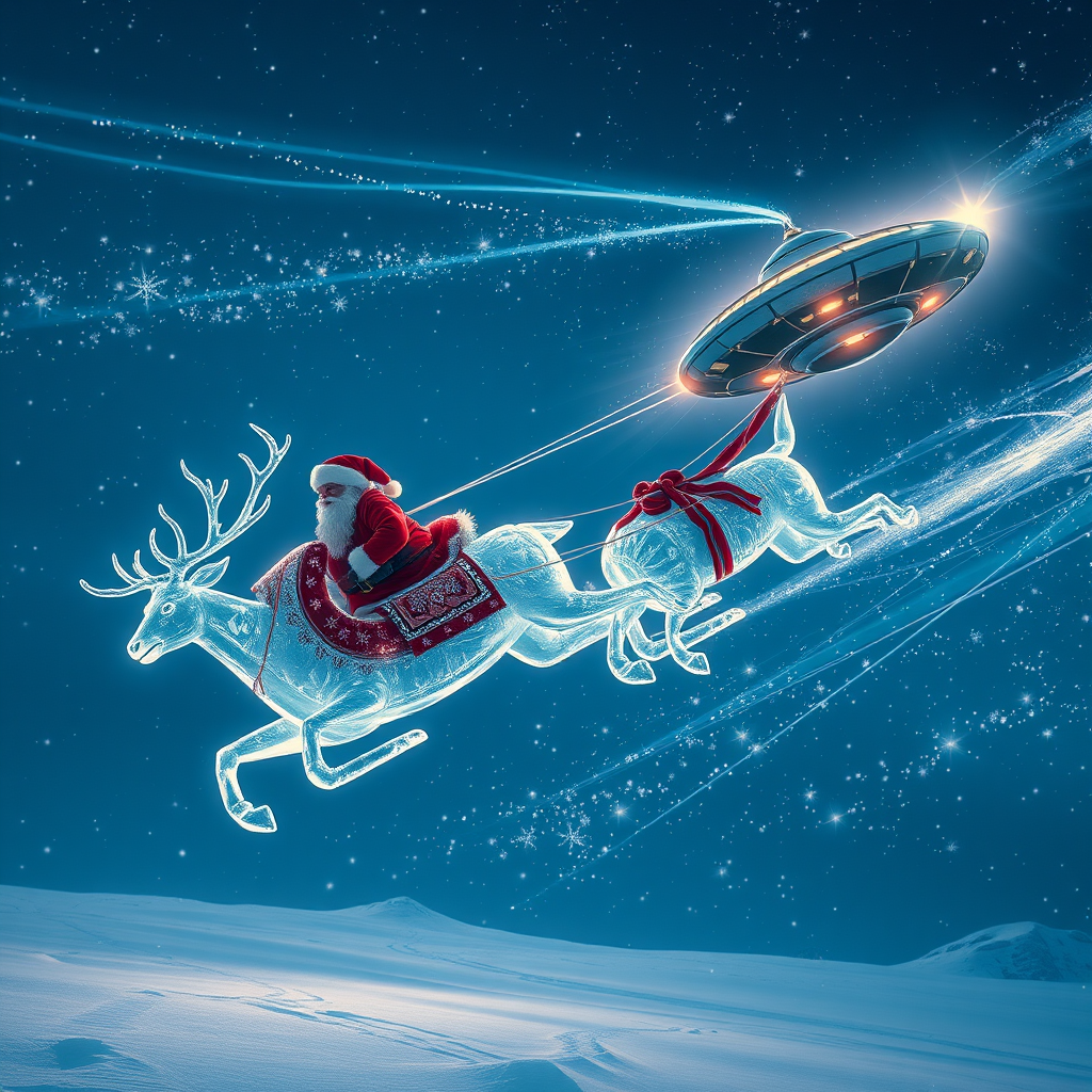 In a magical winter sky, Santa commands a gleaming ice sleigh, intricately carved and pulled by majestic ice deer. These crystalline creatures glide effortlessly through the frosty air, their breath visible in the cold night. Amidst this enchanting scene, a thrilling aerial encounter unfolds—Santa's sleigh gracefully twists and turns in a captivating dogfight with a shimmering UFO, its metallic surfaces catching the starlight. The sky dances with luminescent trails and sparkling flurries, as ancient magic meets futuristic technology in an epic, otherworldly adventure.