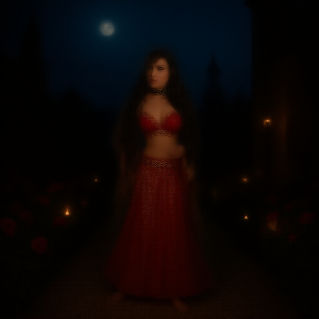 In a medieval castle courtyard at the edge of dusk, a mesmerizing beauty graces the scene, her red and gold belly dancer's attire shimmering under a symphony of full moonlight, torchlight, and the gentle flicker of candlelight. The glowing illumination casts an enchanting aura around her, highlighting her elegant pose as she stands barefoot amidst a vibrant bed of flowers. Her eyes engage the viewer with a captivating allure, while a sleek black choker adds a touch of mystery to her neckline. Her waist-length wavy raven locks cascade gracefully down her back as she turns her head slightly, offering a tantalizing over-the-shoulder gaze. Captured using a Leica M10 and a Helios-44 58mm f/2 lens with the aperture set to f/2.8, the photograph showcases lush, deep hues and exquisite highlights. The soft, natural moonlight caresses her features, complementing the mid-dusk glow that accentuates her striking expression, while the diffused light gently contours her silhouette.