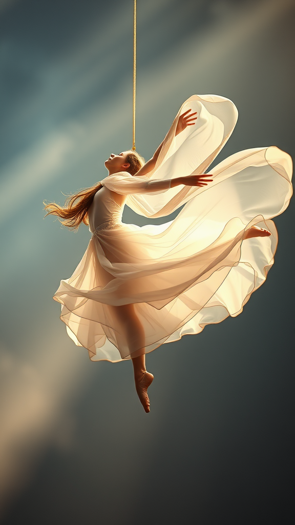 In a mesmerizing ballet of fluid motion, the celestial grace is encapsulated in this portrayal of a dancer suspended in air. Gentle pastel shades, enchanting backlighting, and billowing fabric contribute to an otherworldly atmosphere. The scene is illuminated with dramatic cinematic lighting and rendered in ultra-high resolution, maintaining an elegant 9:16 aspect ratio.