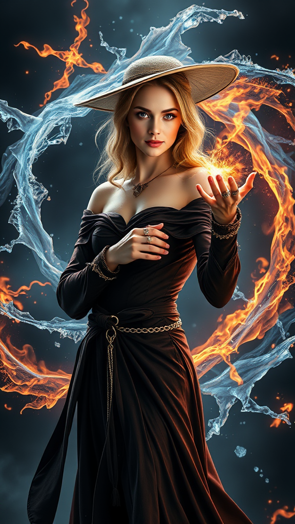 In a mesmerizing dark fantasy realm, a strikingly elegant female wizard stands poised, her slender form a vision of grace and power. She conjures a dazzling spell, with elemental forces swirling around her in a breathtaking ballet of fire, water, wind, and ice. Her alluring off-shoulder costume is adorned with ornate rings, each piece showcasing exquisite detail and texture. Her radiant fair skin exudes a soft, ethereal glow under the gentle light, highlighting her captivating blue eyes and enchanting smile. The elements dance around her in a perfect, dynamic harmony, creating an ultra high-resolution masterpiece that is both enchanting and awe-inspiring.