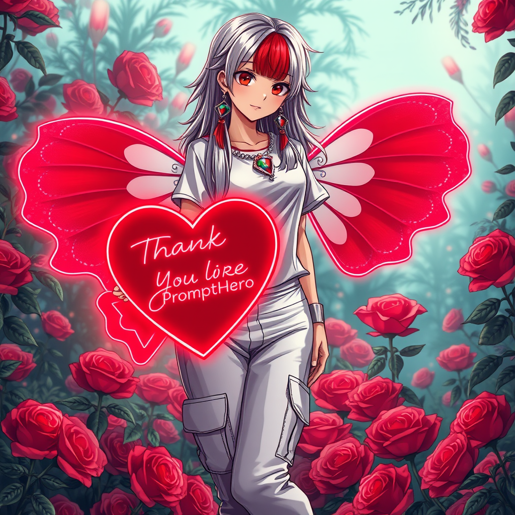 In a mesmerizing illustration, a gothic anime woman with striking silver and ruby-red hair stands amidst a captivating garden, exuding an Egyptian allure. She is dressed in a modest yet stylish professional Gala T-shirt and cargo pant dress, predominantly in red and white hues, highlighting her athletic beauty. With casual poise, she holds a large neon heart-shaped sign-staff, emblazoned with the words "Thank You PromptHero," her legs confidently positioned at a slight 45-degree angle. Her gaze is alluring and direct, enhanced by a ruby-diamond heart pendant and oversized heart earrings that radiate elegance. Completing her enchanting look are neon ruby-red and silver glittery butterfly wings that shimmer with ethereal beauty. The rich backdrop of an opulent garden is filled with vibrant neon black ruby glass roses, creating an atmosphere of luxury and enchanting allure.