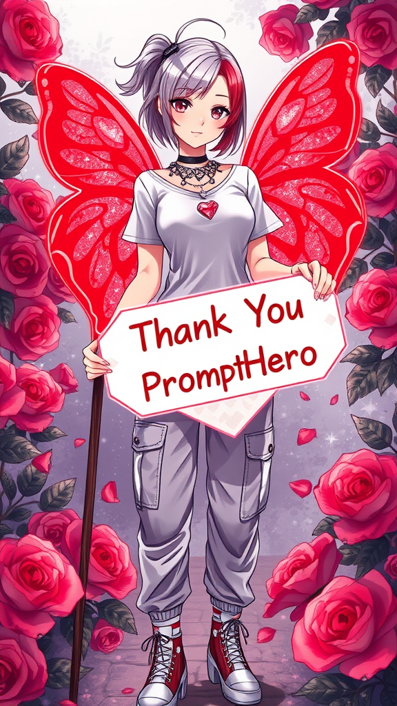 In a mesmerizing illustration, a gothic anime woman with striking silver and ruby-red hair stands gracefully in a captivating garden. Her ensemble, a chic Gala T-shirt paired with stylish cargo pants, showcases a harmonious blend of red and white, highlighting her athletic elegance. Casually holding a large neon-outlined, heart-shaped sign-staff displaying the phrase "Thank You PromptHero," her stance is confident with her legs slightly apart. Her gaze is alluring, drawing attention to her ruby-diamond heart pendant necklace and oversized heart earrings, which shimmer with sophistication. Completing her enchanting look, she flaunts neon ruby-red and silver glittery butterfly wings that add an ethereal touch. The background is adorned with opulent, neon-black ruby glass roses, enveloping her in an atmosphere of luxurious beauty.