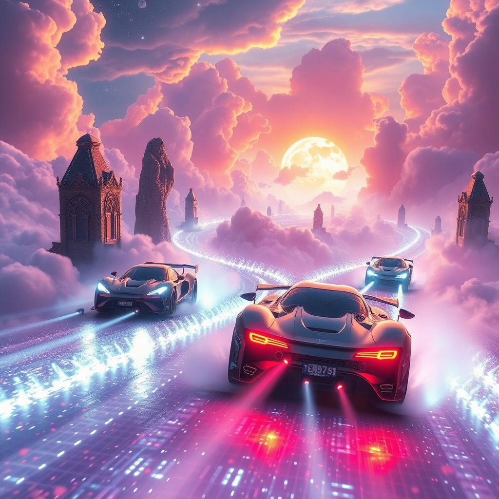 In a mesmerizing magical realm, an exhilarating and surreal car race unfolds as enchanted sports vehicles, inspired by the fast-paced and daring spirit, zoom across shimmering celestial roads formed from clouds. These mystical cars defy gravity, propelled by ancient spells and mystical forces, their engines roaring with a blend of technological brilliance and sorcery. The racers navigate through dazzling landscapes of floating islands and enchanted waterfalls, their paths challenged by unpredictable cloud formations and magical storms. As they dash with breathtaking speed, the vehicles leave trails of radiant light behind, capturing the essence of high-octane excitement in a world where the impossible becomes reality.