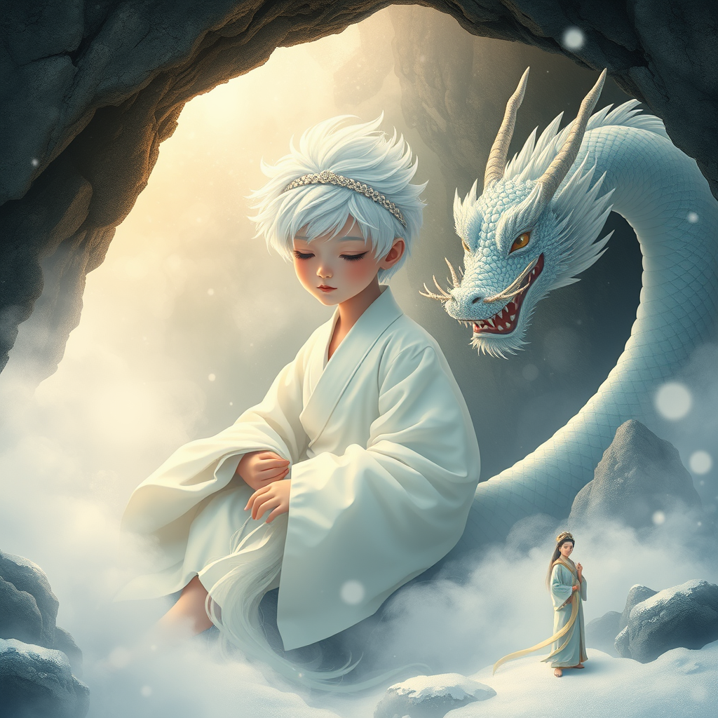 In a mesmerizing scene reminiscent of a Chinese fairy tale, a young Chinese boy with striking white hair resides peacefully in a mystical cave. He is of celestial origin, wearing a flowing white Daofu that seems to shimmer in the soft, diffused light. A delicate headband crowns his head, accentuating his ethereal appearance. By his side, a majestic Chinese dragon coils protectively, its scales glistening like pearls in the misty air. Surrounding them is a beautifully crafted landscape in the style of Japanese Ukiyo-e, where graceful figures move with elegance among the whorls of mist. Snow lies gently over the ground, casting a serene, otherworldly glow, adding to the enchanting and dreamlike quality of the scene.